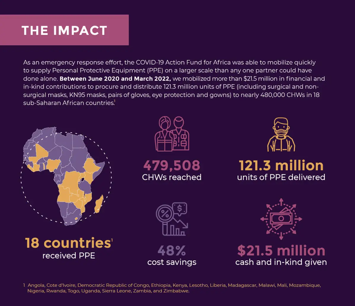 In the early days of the pandemic, communities across sub-Saharan Africa faced potential disruption of health services. Community health workers (CHWs) play a vital role in health service delivery, especially in countries with less resilient health systems. However, they are often the last in line to receive necessary health products and protective equipment, which affects their ability to safely serve their communities. The Network and four partners (Community Health Impact Coalition, Community Health Acceleration Partnership, Direct Relief, and VillageReach) came together to form CAF-Africa as an emergency response effort to supply CHWs with personal protective equipment (PPE).
